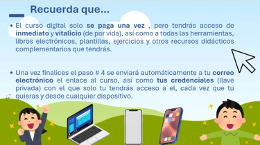 Flexibilidad Total: Accede al contenido del curso desde cualquier lugar y en cualquier momento. Aprende a tu propio ritmo con lecciones estructuradas y materiales descargables.